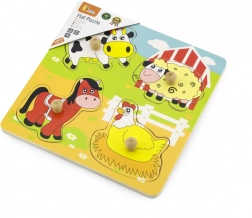 Le plateau en bois résistant d’environ 22 × 22 cm est richement illustré sur le thème de la ferme, ce qui motive les enfants à poursuivre le jeu et à développer leur vocabulaire (p. ex. vache, mouton, cheval, poule). Le jouet convient dès 12 mois et, grâce à ses dimensions compactes, se range et se transporte facilement.