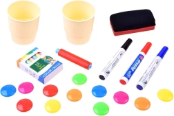 - Aimants, marqueurs effaçables à sec avec gomme, gomme, craies de couleur, porte-craie, gobelets, étagère