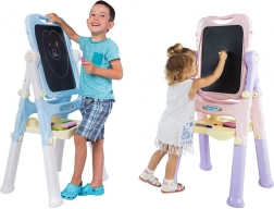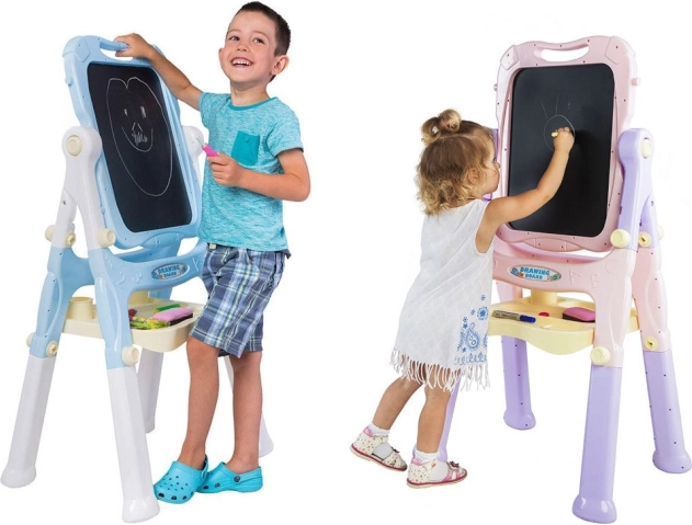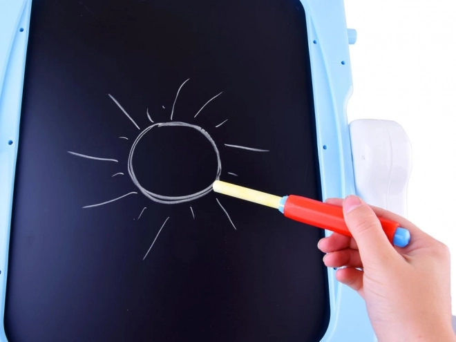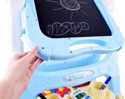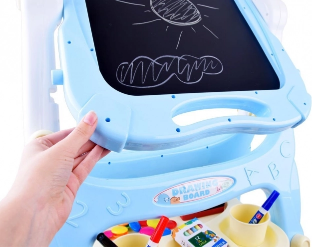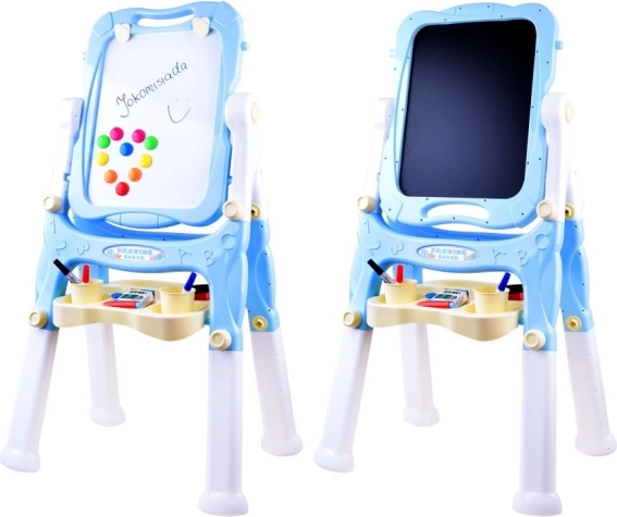 Cette ardoise-peinture stable avec cadre bleu pastel stimule la créativité et l’apprentissage. Un côté est magnétique pour les marqueurs effaçables à sec et la fixation d’aimants ou de feuilles, l’autre côté est une classique surface noire pour dessiner à la craie colorée. Grâce à l’étagère pratique, aux gobelets et aux supports, vous avez toujours tout le matériel à portée de main.