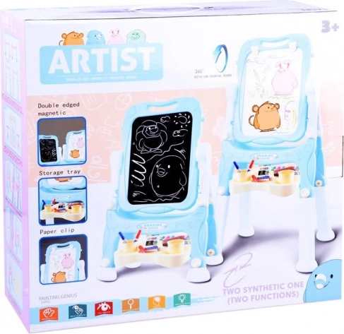 Grande ardoise pour enfants double face avec surface rotative, combinant une face blanche magnétique pour feutres effaçables et une face noire pour la craie. Inclut des compartiments et gobelets de rangement, un espace pour fixer du papier, et de nombreux accessoires pour apprentissage et jeu créatifs.