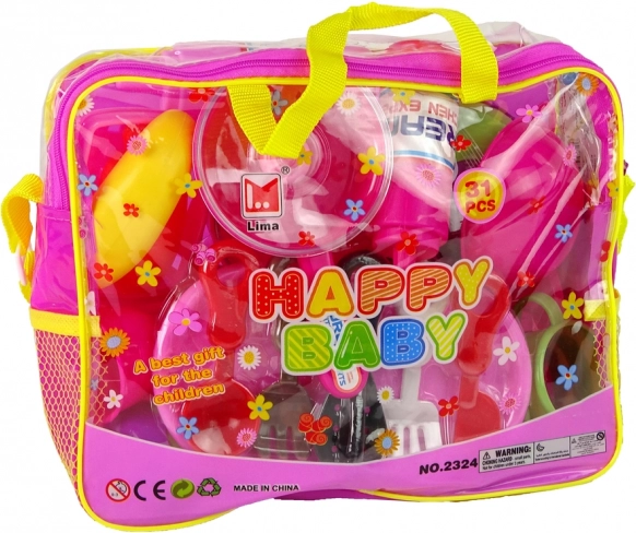 Dimensions de l'emballage : 26 cm x 20 cm x 8 cm. L'ensemble est fabriqué en plastique écologique et sûr pour les enfants, qui imite fidèlement la vraie vaisselle et les ustensiles de cuisine.