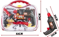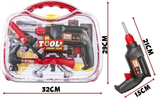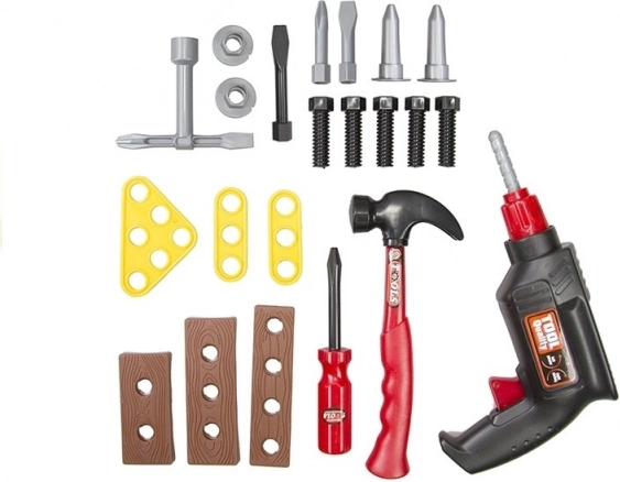 Le set comprend une perceuse jouet réaliste, un tournevis fonctionnel avec embouts interchangeables, un petit marteau, des vis et trois plaques pour s’exercer au montage. Le tout est fabriqué en plastique léger et résistant, sûr pour le jeu des enfants.