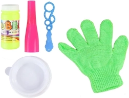 - Gant (taille universelle), bol/socle pour la solution, baguette à bulles, entonnoir/tube rose, bouteille de solution pour bulles