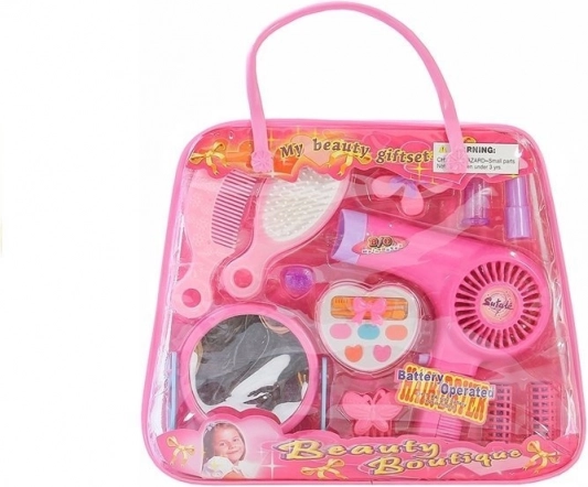- Équipement complet : sèche-cheveux à piles, miroir sur support, brosse, peigne, 2 bigoudis, barrette nœud papillon, élastique à fleur, palette de fards à paupières, rouge à lèvres, bague avec cœur.
