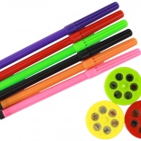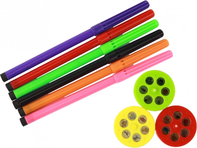 L'ensemble comprend tout ce dont vous avez besoin pour vous amuser : 6 stylos de différentes couleurs et 2 ensembles de motifs qui peuvent être projetés sur un mur ou du papier. Un total de 12 images à créer.