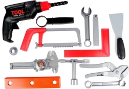 - 31 pièces dont une perceuse, une scie, un marteau, des clés et des tournevis