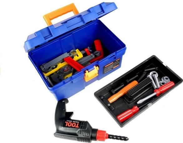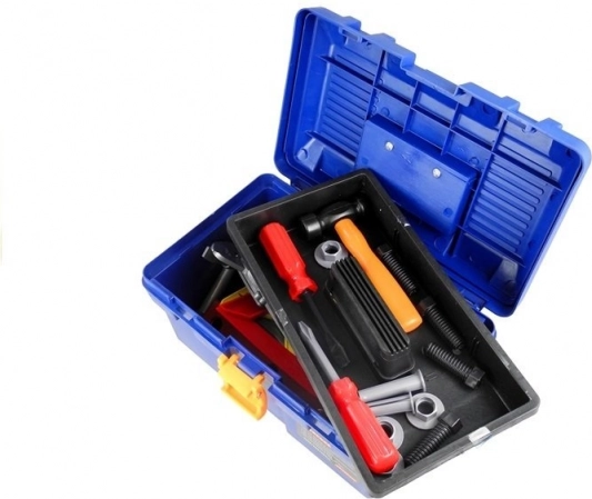 - mallette, perceuse, marteau, scie à main, clé à molette, clé œil, clé à douille, clé plate, tournevis cruciforme, tournevis plat, vis et écrous, pied à coulisse, spatule, lime, niveau à bulle, équerres, plaques de liaison perforées