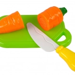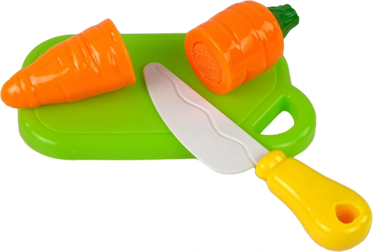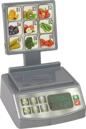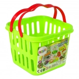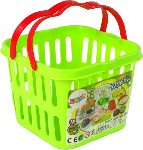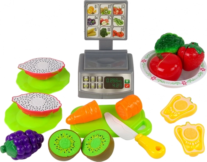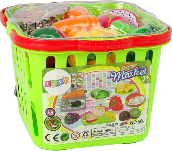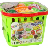 L’ensemble se compose d’un panier vert rempli de différents fruits et légumes, ainsi que d’un bol, d’assiettes, d’un couteau, d’une planche à découper et d’une balance de magasin. Les aliments peuvent être disposés sur la planche fournie et coupés avec le couteau spécial. Les moitiés de fruits et légumes peuvent être pesées sur la balance, qui est une copie fidèle de celles des supermarchés, puis placées sur les assiettes ou mélangées dans le bol. Une fois la dégustation terminée, les moitiés de fruits et légumes peuvent être facilement et instantanément reconnectées. Comment ? Tous les aliments sont équipés de bandes spéciales en velcro permettant de les séparer et de les assembler à volonté.
