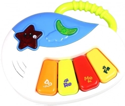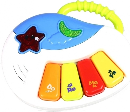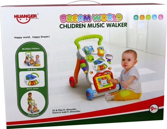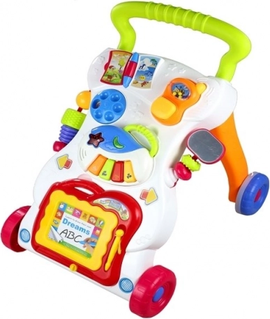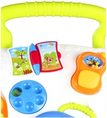 Un petit piano avec mélodies, des roues tournantes, un petit livre et un téléphone-hochet stimulent le développement sensoriel ainsi que l’apprentissage des chiffres et des formes.