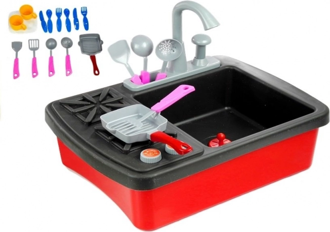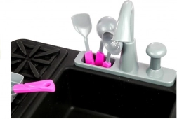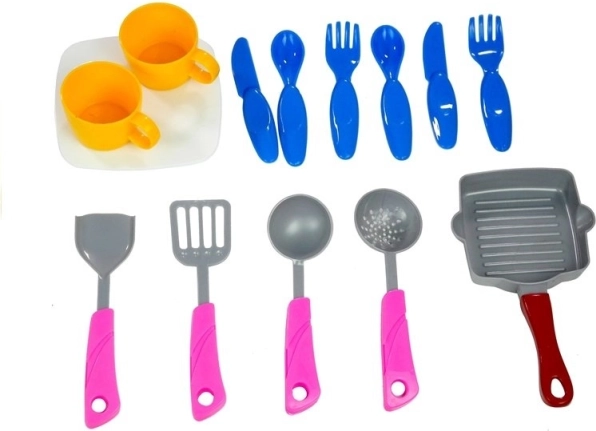Ce jouet comprend un set de cuisine complet, composé d’une cuisine avec évier, d’une poêle, de 2 petites assiettes, de 2 tasses et d’un set de couverts incluant cuillère, fourchette et couteau. Les enfants peuvent utiliser la spatule et la louche pour simuler la cuisson et le lavage de la vaisselle.