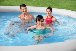 Pratique et hors‑sol, cette piscine pour toute la famille se prépare en quelques minutes. Gonflez l’anneau supérieur, raccordez un tuyau d’arrosage pour une vidange aisée et profitez d’une eau limpide grâce à la pompe de filtration fournie. Le matériau triple couche, résistant aux déchirures, assure une longue durée de vie.
