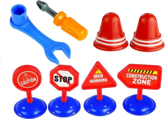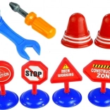 Le set comprend des figurines, des outils et des panneaux de signalisation qui apprennent aux enfants le monde des réparateurs et les outils de base par le jeu.