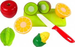 Le couteau en plastique et les fruits reliés par scratch permettent aux enfants de s’initier à la découpe en toute sécurité. Assembler et séparer les moitiés à répétition développe la motricité fine et la précision.