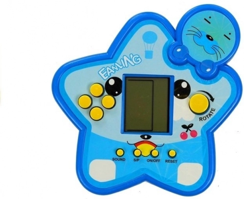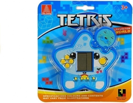 Jeu électronique de poche TETRIS en forme de petite étoile de couleur bleue, offrant un divertissement malin pour enfants et adultes. Entraînez votre cerveau en empilant des blocs qui tournent et se déplacent afin de compléter des lignes entières. Le jeu est léger, hautement portable et, grâce à son écran lisible et à ses boutons de commande, vous en profiterez à tout moment – à la maison, en déplacement ou pendant les pauses.
