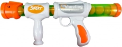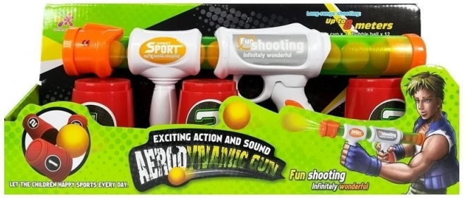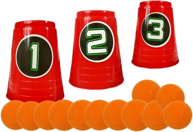 Le paquet comprend 12 balles molles et plusieurs gobelets numérotés pour améliorer la visée et le jeu stratégique. Le design en couleurs blanc-orange donne au produit un aspect moderne, tandis que le réservoir semi-transparent permet de suivre facilement la quantité de munitions disponibles.