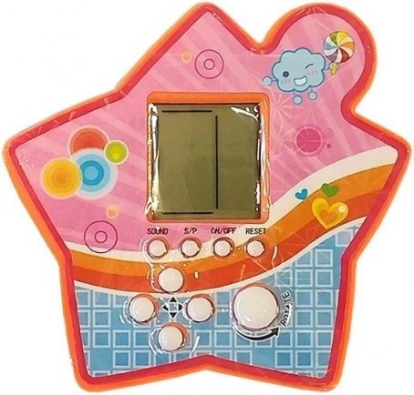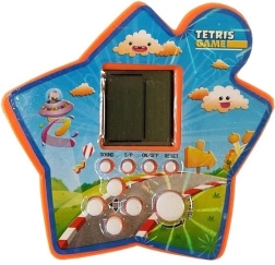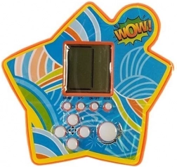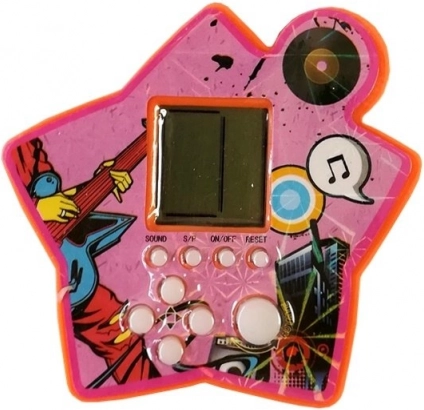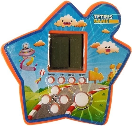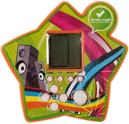 Le jeu électronique de poche en forme d’étoile offre un divertissement intemporel avec des pièces qui tombent. Le but est de faire pivoter et déplacer les formes pour remplir une ligne entière – elle disparaît ensuite et libère de la place pour continuer. À chaque ligne supprimée, la vitesse augmente et le défi pour votre concentration et votre stratégie grandit.