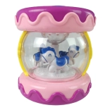 Le tambour est équipé d’un carrousel avec des petits chevaux à l’intérieur, offrant une expérience visuelle interactive pour les enfants.