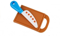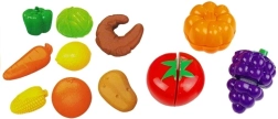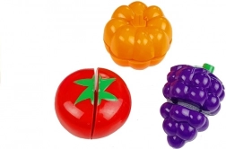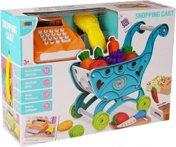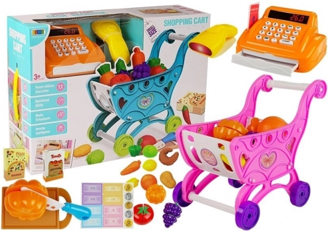 L'ensemble comprend divers accessoires tels qu'un chariot de courses, des simulations d'aliments sous forme de tomate, carotte ou potiron, ainsi qu'un faux scanner et une caisse enregistreuse.