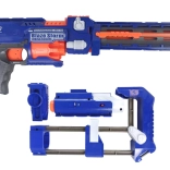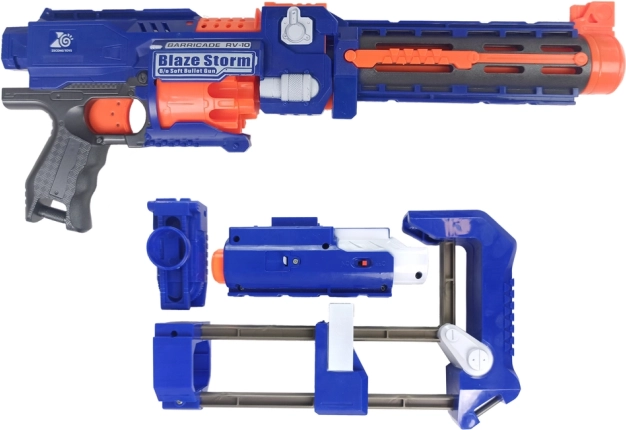 La carabine à fléchettes en mousse est dotée d’une construction massive qui permet une prise en main confortable et une utilisation polyvalente. Elle comprend deux rails pour le montage d’accessoires – l’un sous le canon pour fixer un support avec lampe rouge, et l’autre avec crosse amovible pour un appui à l’épaule. Le mécanisme rotatif du barillet avec chambres ouvertes permet un rechargement facile.