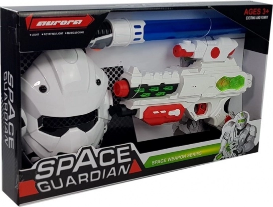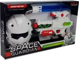 L’équipement de combat spatial se compose d’un pistolet et d’un sabre télescopique. Le schéma de couleurs de ces moyens de défense associe des teintes sobres et vives à un rouge intense et à une nuance corail. Le masque inclus dans le set est conçu dans une palette blanc-gris, possède une ouverture rectangulaire pour les yeux, des orifices au niveau de la bouche et une sangle élastique fixée à l’arrière pour maintenir le masque en place pendant le jeu.