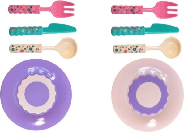 Le jouet inclut des bols colorés et des couverts qui rehaussent le jeu en simulant un véritable repas.