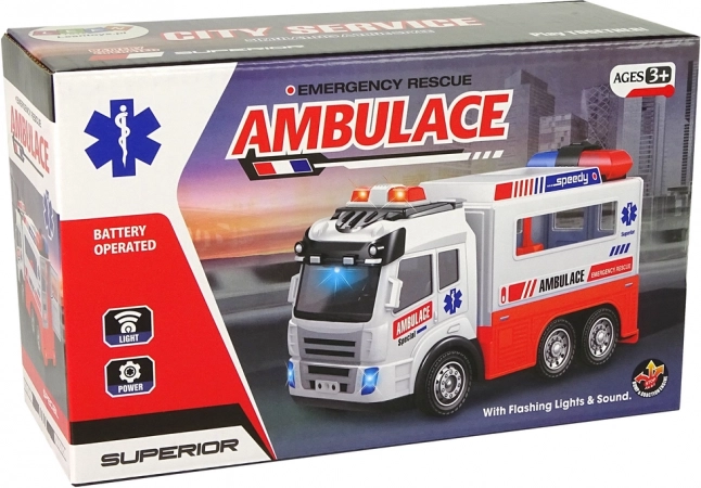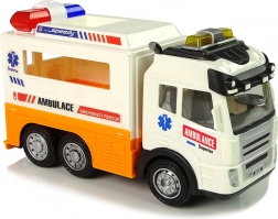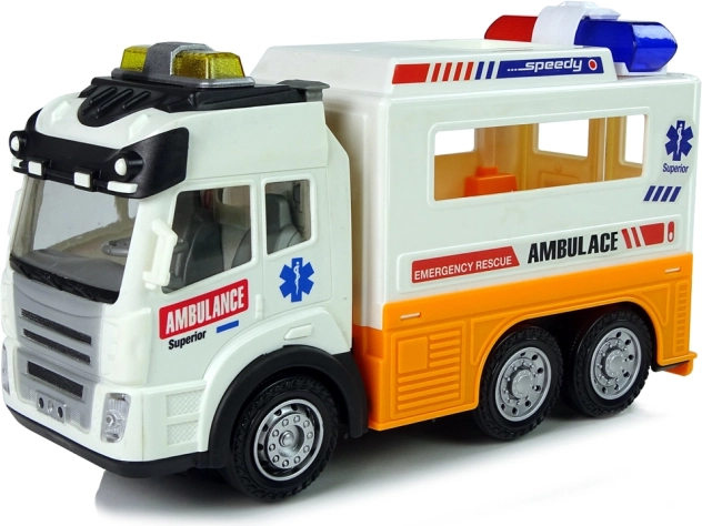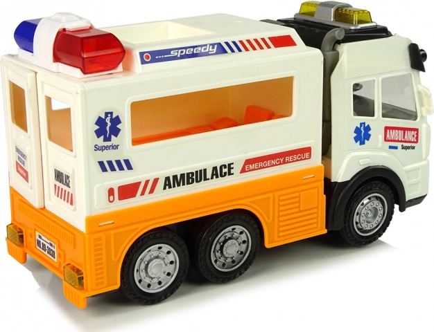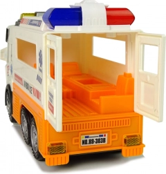 L’ambulance à piles avec effets lumineux et sonores séduira tous les garçons et filles qui aiment les véhicules. À l’arrière, des portes ouvrantes dévoilent un intérieur détaillé avec un brancard et de la place pour l’équipement médical. Le jouet est conçu dans une belle couleur blanche avec des éléments orange et des inscriptions typiques d’une ambulance.