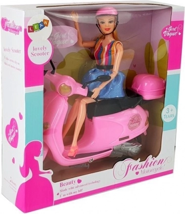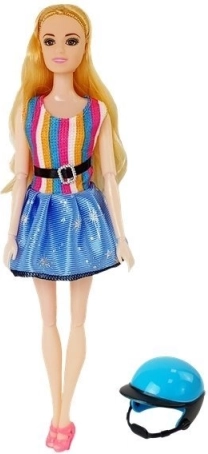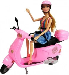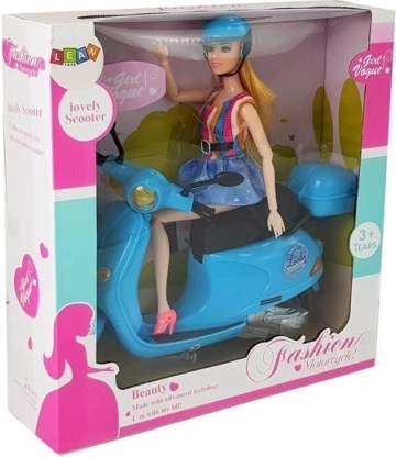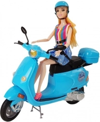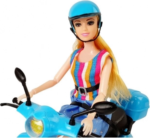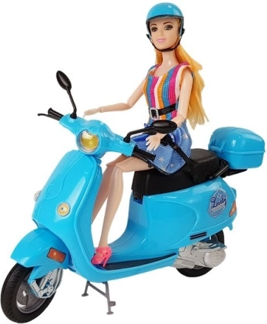 La poupée du set a de longs cheveux blonds qui peuvent être coiffés et stylisés. Elle est vêtue d’une robe stylée à rayures bleues et multicolores, ce qui complète son look élégant. Des bras et des jambes articulés permettent d’asseoir facilement la poupée sur le scooter, offrant aux enfants la possibilité de créer leurs propres scénarios et histoires.