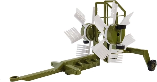 L’andaineur vert et blanc avec doigts rotatifs enseigne aux enfants les principes du ramassage de l’herbe ou du foin et élargit les possibilités de jeu.