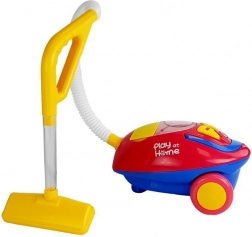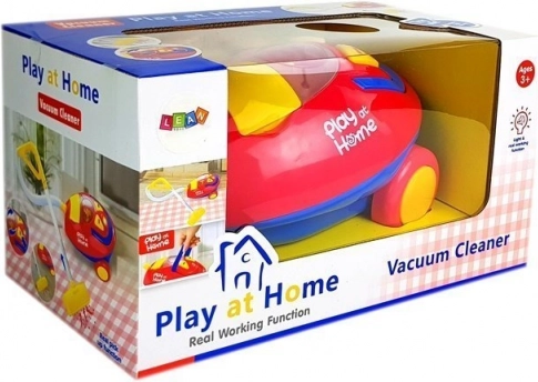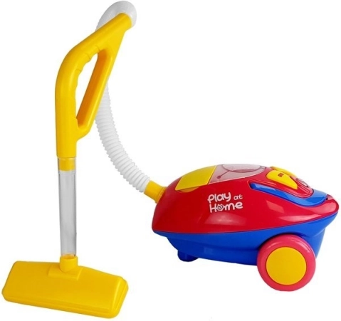 Amusant aspirateur pour enfants PLAY AT HOME au coloris rouge et jaune, avec effets lumineux et sonores, des billes tourbillonnantes dans le réservoir et une conception légère pour les petites mains. Il favorise le jeu de ménage, le développement du sens des responsabilités et de la motricité fine. Inclus : accessoires comprenant tuyau, tube et embout ; alimentation 3× 1,5 V C, convient aux enfants dès 3 ans.