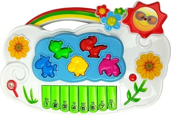Le piano comprend 8 touches et cinq éléments animaux (chat, perroquet, cheval, mouton, éléphant) à placer aux bonnes positions – une excellente forme de divertissement et d’entraînement de la motricité fine. Le jouet propose le choix de 2 langues (anglais, espagnol) pour un apprentissage ludique des mots et des sons.