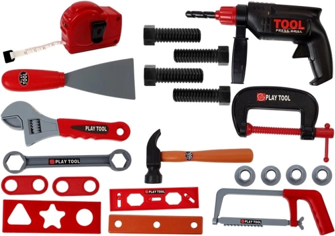 - valise, spatule, marteau, niveau à bulle, 4 vis avec écrous, pièces de construction, clé à cliquet/à douille, clé réglable (dite « clé à molette »), scie, étau, perceuse