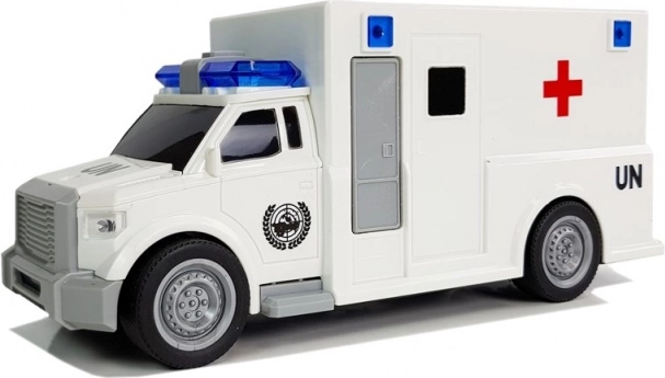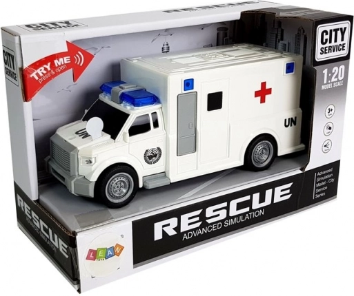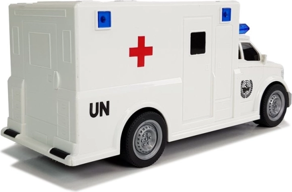 Ambulance pour enfants réaliste à l’échelle 1:20 avec effets lumineux et sonores et moteur à friction, idéale pour tous les petits secouristes. Elle possède des roues en caoutchouc, est légère et résistante et, grâce à ses dimensions compactes, se manie facilement. Fournie avec des piles et dotée de la certification CE conforme à la norme EN 71.