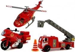 Entrez dans l’univers des opérations de secours avec ce set polyvalent de véhicules de pompiers. Les enfants peuvent partir au feu avec ce qu’ils veulent – la moto rapide, le robuste camion de pompiers ou l’hélicoptère de secours avec lumières et sons. Les cônes fournis aident à sécuriser la zone d’intervention et favorisent un jeu réaliste.