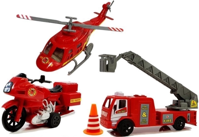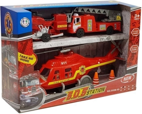 - 3 véhicules dans un seul coffret – hélicoptère, camion de pompiers, moto
