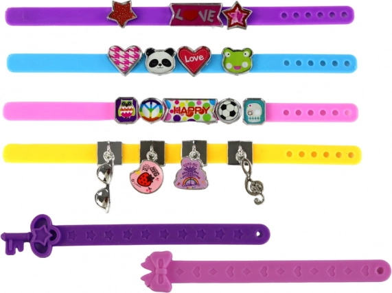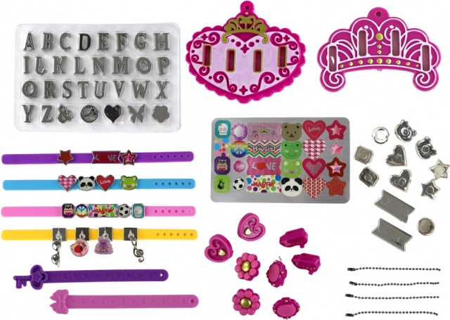 Le kit comprend des bandes pour bracelets, des chaînettes, de grandes breloques, des lettres, des autocollants et des formes décoratives – les enfants peuvent commencer à créer immédiatement.