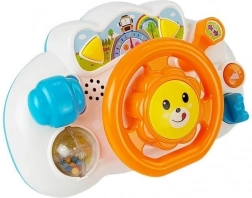 Volant interactif ludique pour les tout-petits en coloris orange, offrant un univers de lumières, de sons et de musique. Grâce au corps mobile, au levier de vitesses, au miroir et aux boutons à effets, il développe la motricité fine, la perception sensorielle et la coordination œil-main. Idéal à la maison comme en voiture, sûr pour les enfants à partir de 18 mois.