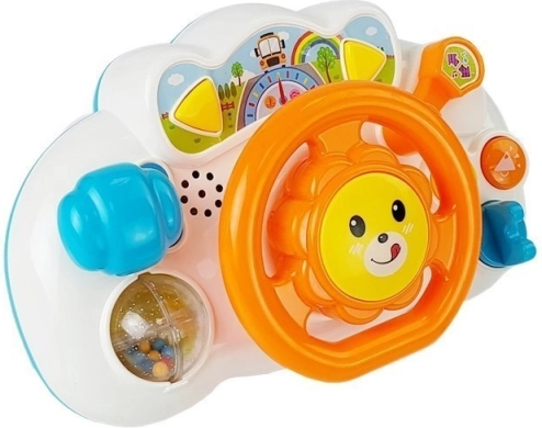 Le jouet comprend un riche ensemble d’éléments interactifs : levier de vitesses à trois positions avec son de tic-tac, bille mobile avec bruissement et perles, volant émettant un cliquetis lors de la rotation, deux boutons avec musique et effets sonores, démarrage à clé avec bruit de moteur et lumière changeante, ainsi qu’un miroir réglable pour s’exercer à l’orientation.