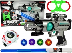 L'ensemble d'armes spatiales Space Guardian est un paquet complet pour tous les petits aventuriers. Il est équipé non seulement d'un pistolet laser, mais aussi d'une épée lumineuse, de menottes et d'un lance-disques pour une expérience de jeu complète. Grâce aux effets lumineux et sonores, jouer avec cet ensemble est plus captivant et créatif.