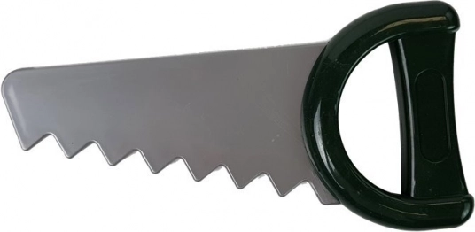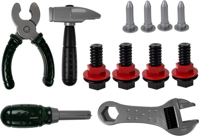 Scie, marteau, pince, tournevis, clé, vis, écrous et plaquettes à visser – le tout en plastique résistant sans arêtes vives.