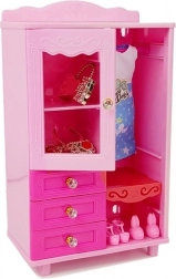 Une armoire pratique avec étagères et tiroirs aide les enfants à trier les vêtements, chaussures et accessoires de la poupée.