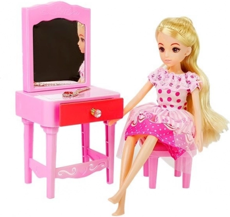 La coiffeuse rose avec miroir et tabouret permet de créer des coiffures et de préparer la poupée pour chaque journée.