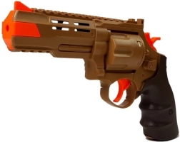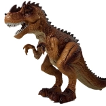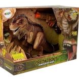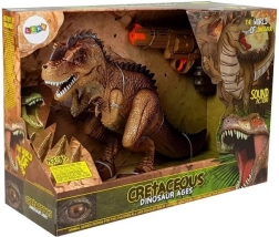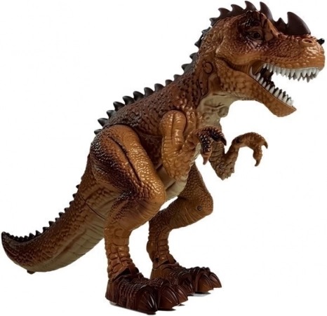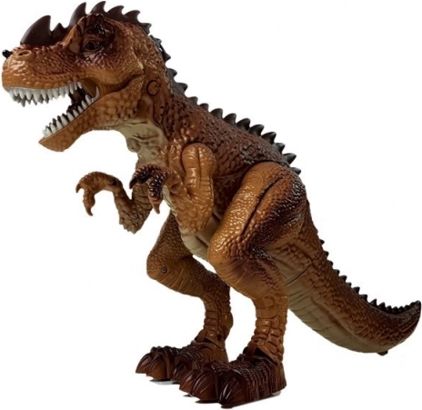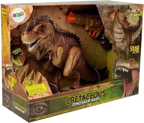 Le dinosaure interactif ravira tous les fans de la préhistoire et des histoires d’action. Une fois allumé, il avance tout seul, on entend les pas et un rugissement effrayant, et ses yeux s’allument en rouge. En appuyant sur la gâchette du pistolet, vous lancez le duel – chaque impact déclenche des effets lumineux et sonores ; au neuvième tir, le T‑rex s’effondre et émet un effet de défaite.