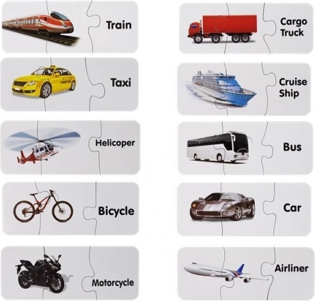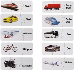 Ce set de puzzles éducatifs allie apprentissage et plaisir. Chaque paire contient l’image d’un moyen de transport et le mot anglais correspondant – l’enfant enrichit ainsi naturellement son vocabulaire tout en entraînant sa mémoire visuelle. La forme auto-corrective des pièces suggère la bonne solution, ce qui permet aux enfants d’apprendre de façon autonome et motivante.