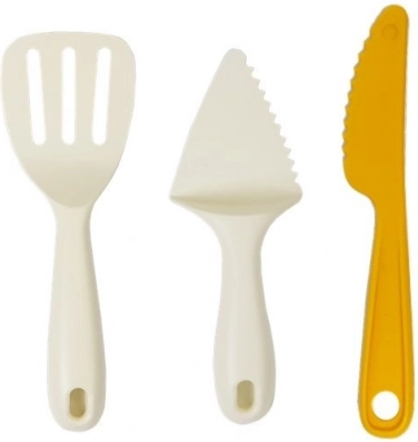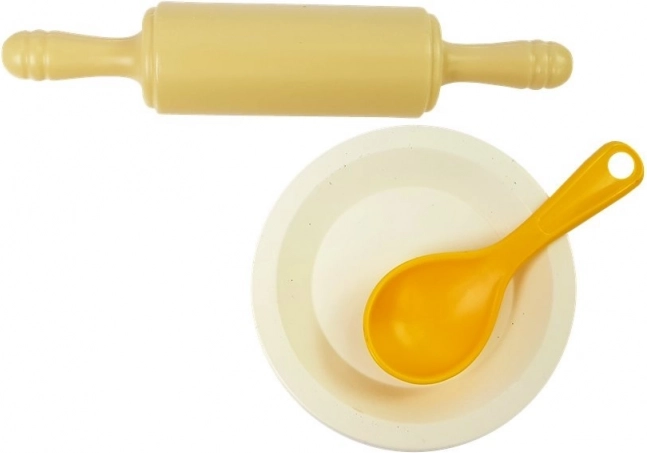 Le set comprend un rouleau, une cuillère, une spatule, un couteau de service et un bol – tout pour un jeu de cuisine réaliste.