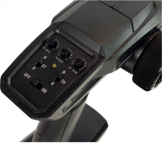 L’émetteur ergonomique permet un dosage progressif des gaz, le réglage de l’angle de braquage et de la limite de vitesse. Sans interférences, idéal pour courir à plusieurs.