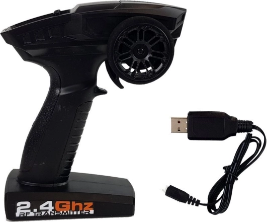- Voiture RC, émetteur 2,4 GHz, accu 7,4 V, chargeur USB, manuel (EN)