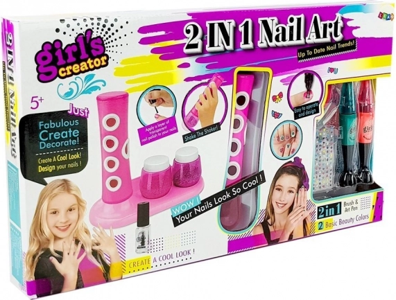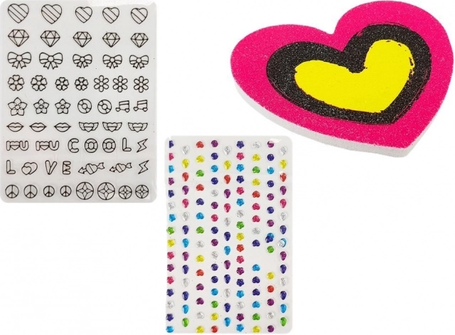 L'ensemble comprend du vernis transparent, deux contenants pailletés, des autocollants colorés en forme de cœur, de fleurs et d'autres formes intéressantes qui ajoutent une touche créative à chaque design.