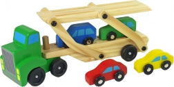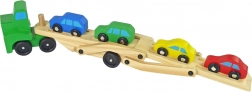 Ce camion de remorquage en bois fera le bonheur de tout jeune fan de moteurs. L’ensemble comprend un camion robuste avec une plate-forme de remorquage à deux niveaux et 4 petites voitures colorées. Grâce à la rampe inclinable (dépliable), les petites voitures montent facilement sur la plate-forme et se transportent en toute sécurité.