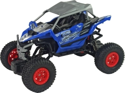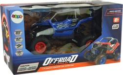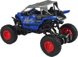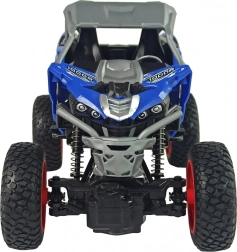 La voiture tout-terrain bleue est équipée de grandes roues rouges et d’une suspension pour rouler sur tout type de surface. Sa structure en plastique garantit la durabilité.