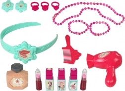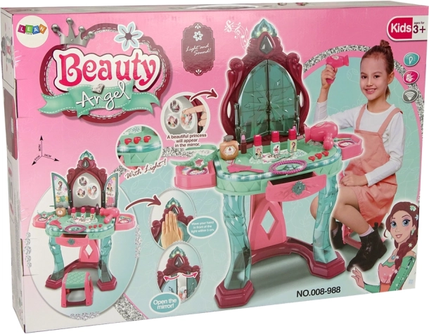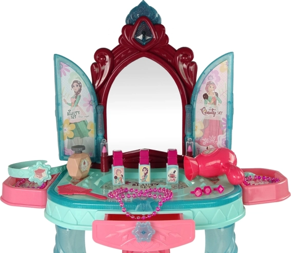 Elle inclut une variété d’accessoires cosmétiques : pièces pour assembler la coiffeuse, autocollants, sèche-cheveux, peigne, vernis à ongles, bagues, bracelets, collier, pinces à cheveux, parfum, rouges à lèvres et un petit tabouret. La coiffeuse arbore des couleurs pastel qui s’intègrent facilement à toute chambre d’enfant.
